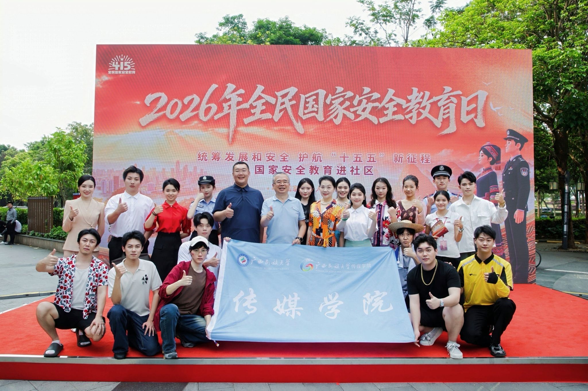 在第十一个全民国家安全教育日即将到来之际,4月13日,自治区2026年全民国家安全教育日主题活动在南宁市蟠龙社区正式启动。广西民族大学传媒学院/国际传播学院师生受邀参与活动,以自编自演的四个国家安全主题教育小品亮相启动仪式,通过寓教于乐的文艺形式,将国家安全知识送入社区,赢得现场观众一致好评,充分展现了民大青年学子的责任担当与专业素养。