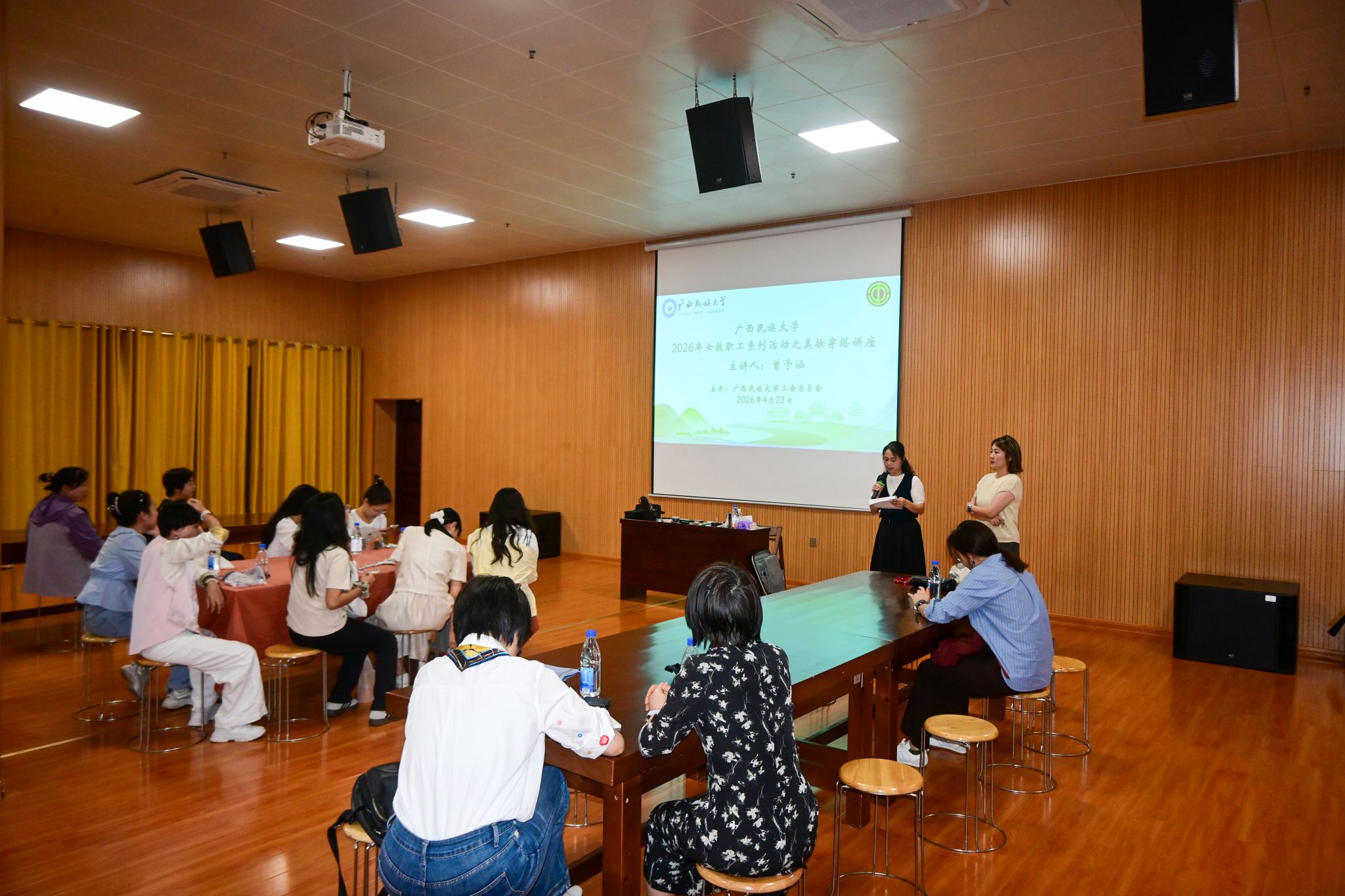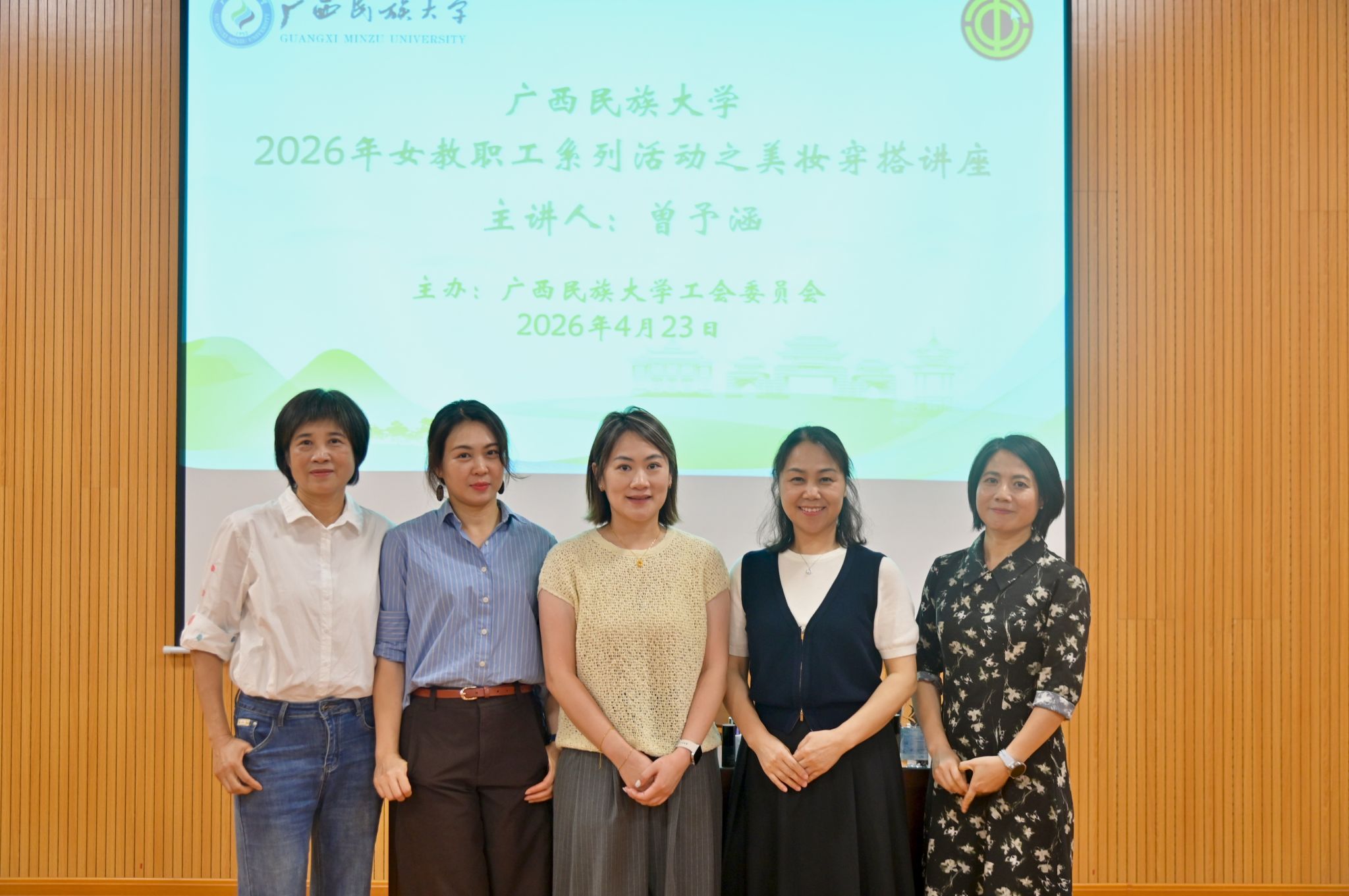 【大学生通讯社报道】4月23日下午,广西民族大学在相思湖校区教职工活动中心举办2026年女职工系列活动之“优雅职场,健康同行——女教职工美妆穿搭与健康课堂”的美妆穿搭讲座。讲座邀请广西戏剧院国家一级舞台美术技师(化妆)曾予涵担任主讲,来自学校各单位的女性教职工代表参加。