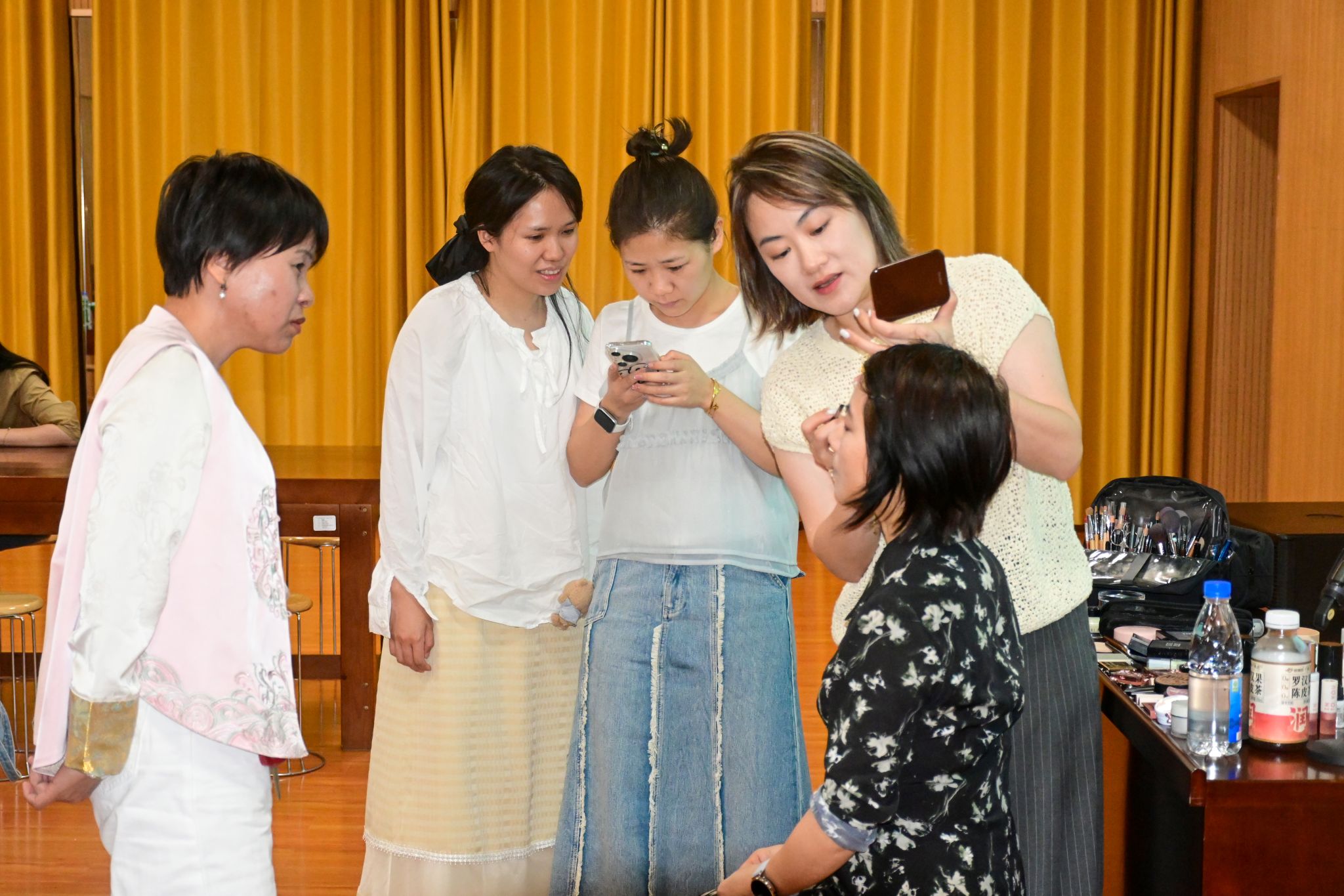 参与活动的教职工积极与老师互动交流,咨询美妆技巧、产品选择及穿搭等相关问题,并动手练习,现场学习氛围浓厚。(初审:何波 实习编辑:梁火琼 复审:韦利坤 终审:孙寿媚)