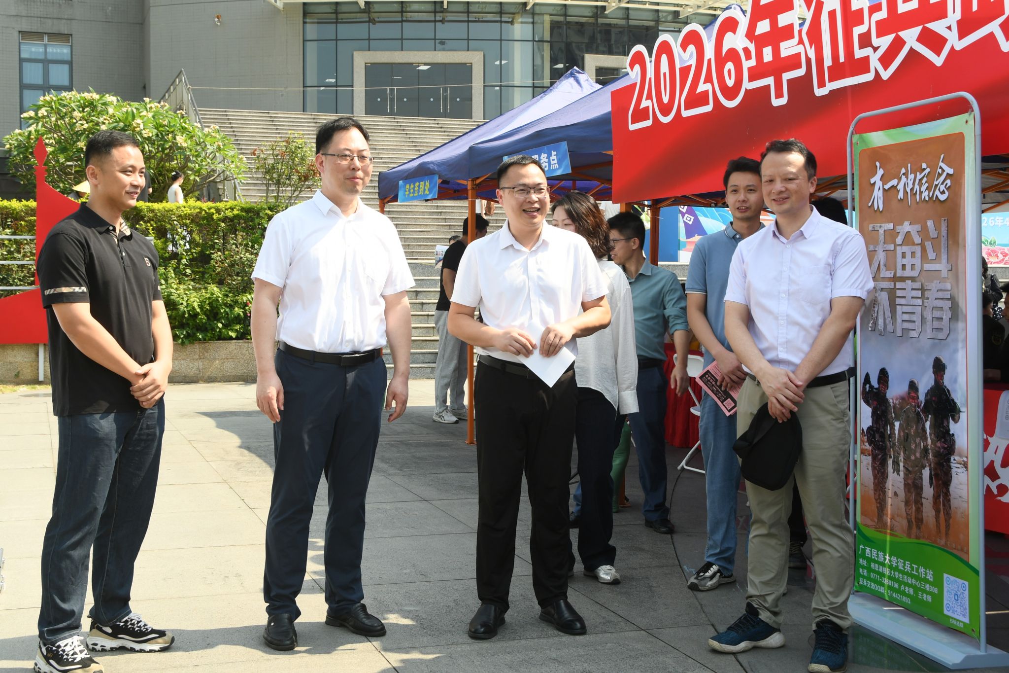 【大学生通讯社报道】4月25日,2026年全国城市联合招聘高校毕业生春季专场活动“火热青春 就在南宁”“千校万岗”广西大中专学生招聘会、广西民族大学春季双选会在思源湖校区图书馆前举行。共青团广西区委学校部负责人、学校有关职能部门负责人出席活动并指导。