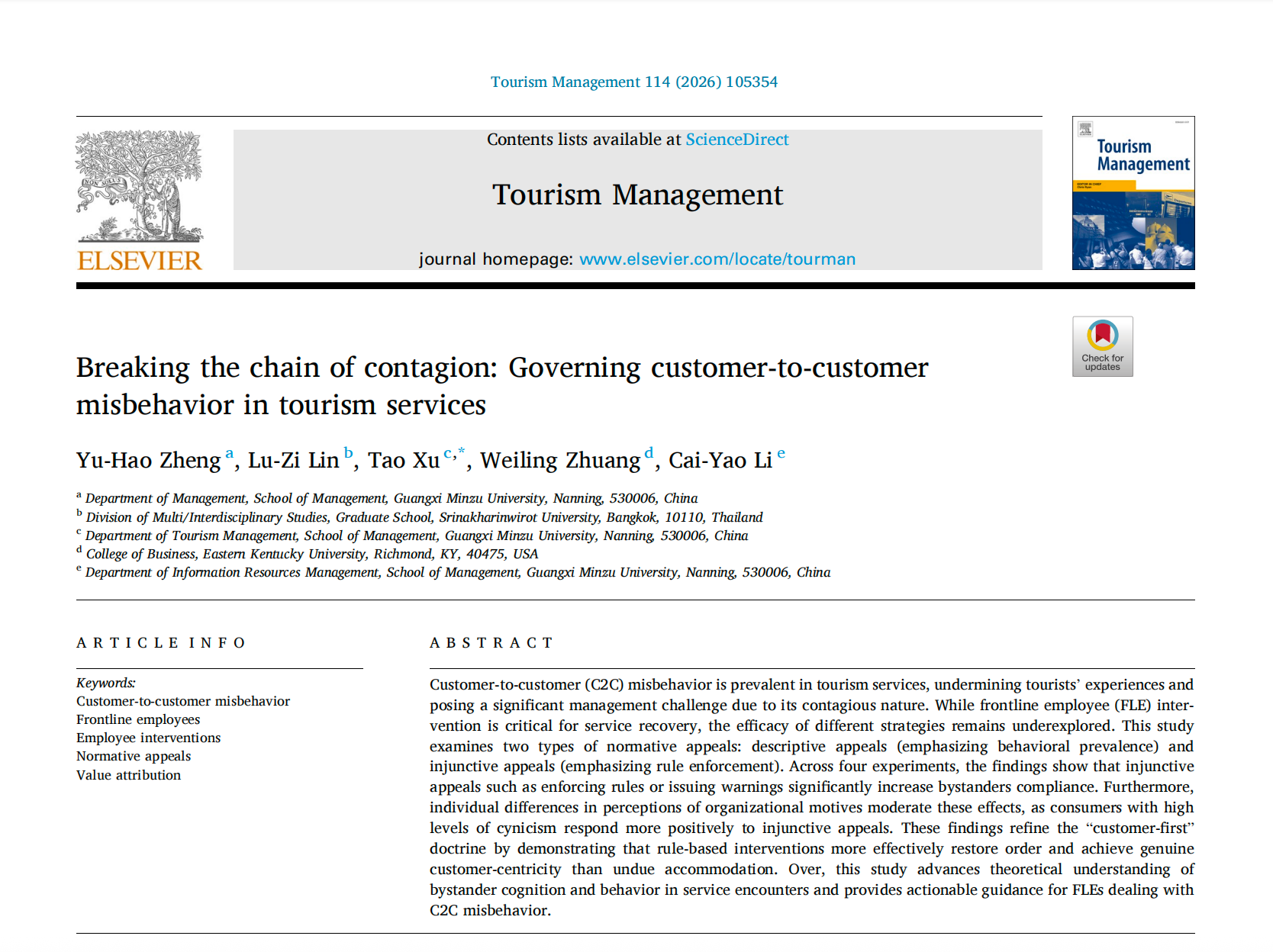近日,广西民族大学管理学院教师郑宇豪(第一作者)、徐涛(通讯作者)和2023级图书情报专业硕士生李偲瑶同学,联合泰国诗娜卡琳威洛大学的林陆子博士和美国东肯塔基大学庄伟凌教授,合作完成的论文Breaking the chain of contagion: Governing customer-to-customer misbehavior in tourism services(《打破传染链:旅游服务中顾客对顾客的不当行为治理》),于2025年11月正式发表于旅游管理领域顶级期刊Tourism Management(《旅游管理》)。