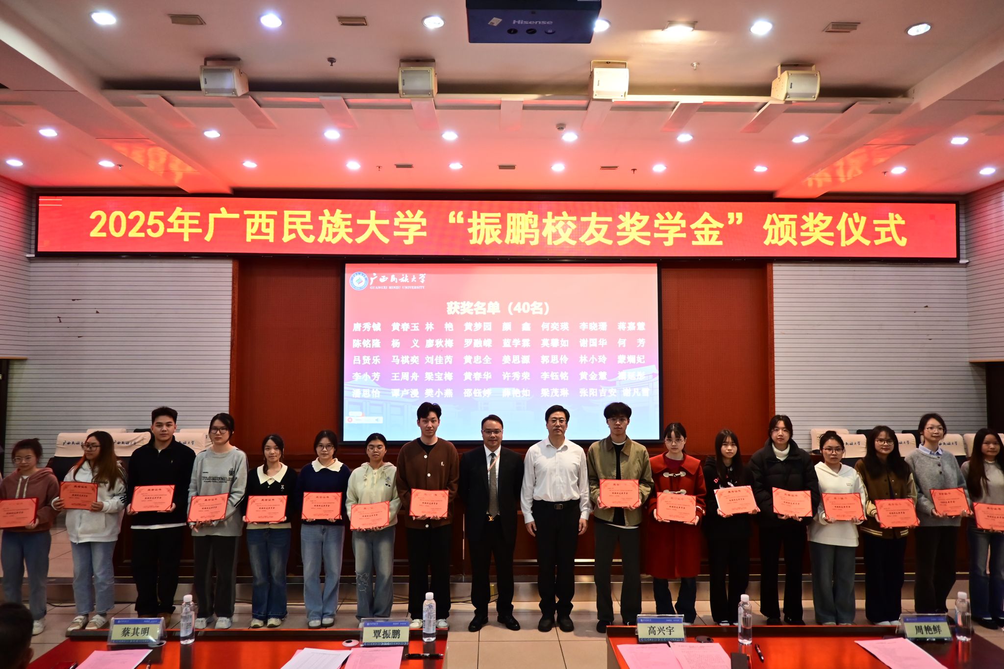 12月30日下午,广西民族大学2025年“振鹏校友奖学金”颁奖仪式在相思湖校区科技楼报告厅举办。副校长高兴宇、校友覃振鹏及公司董事出席仪式。
