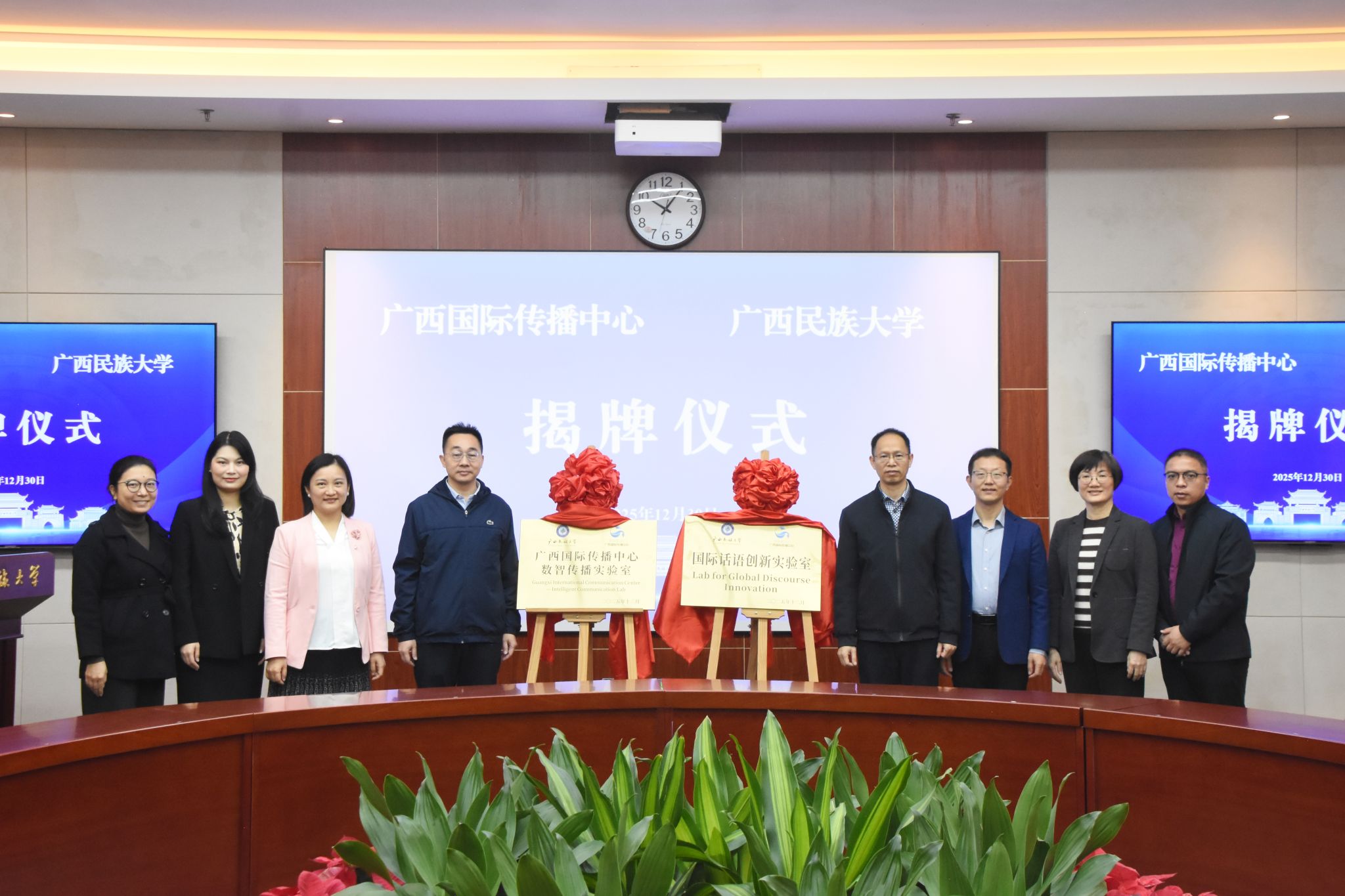 黄弢、梁炎堃共同见证双方代表为广西国际传播中心国际话语创新实验室、数智传播实验室揭牌。(初审:吴大为 编辑:韦丽娜 复审:韦利坤 终审:孙寿媚)