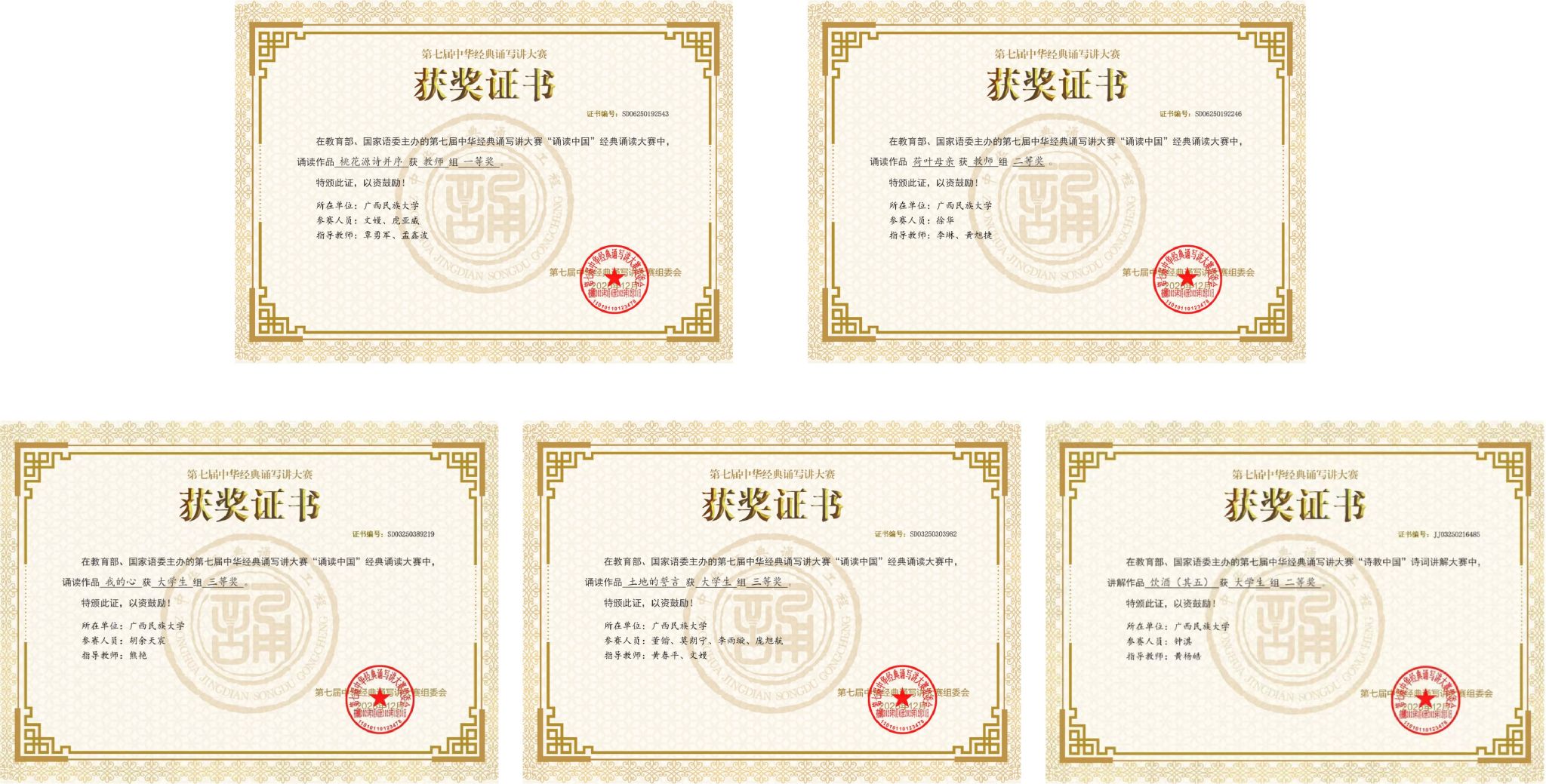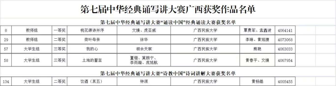 由教育部、国家语言文字工作委员会主办的第七届中华经典诵写讲大赛日前公布获奖名单。广西民族大学传媒学院在“诵读中国”经典诵读与“诗教中国”诗词讲解两个赛道共选送五件作品,其中教师组经典诵读作品《桃花源诗并序》斩获一等奖,《荷叶母亲》荣获二等奖;大学生组诗词讲解作品《饮酒(其五)》荣获二等奖,经典诵读作品《我的心》《土地的誓言》荣获三等奖。