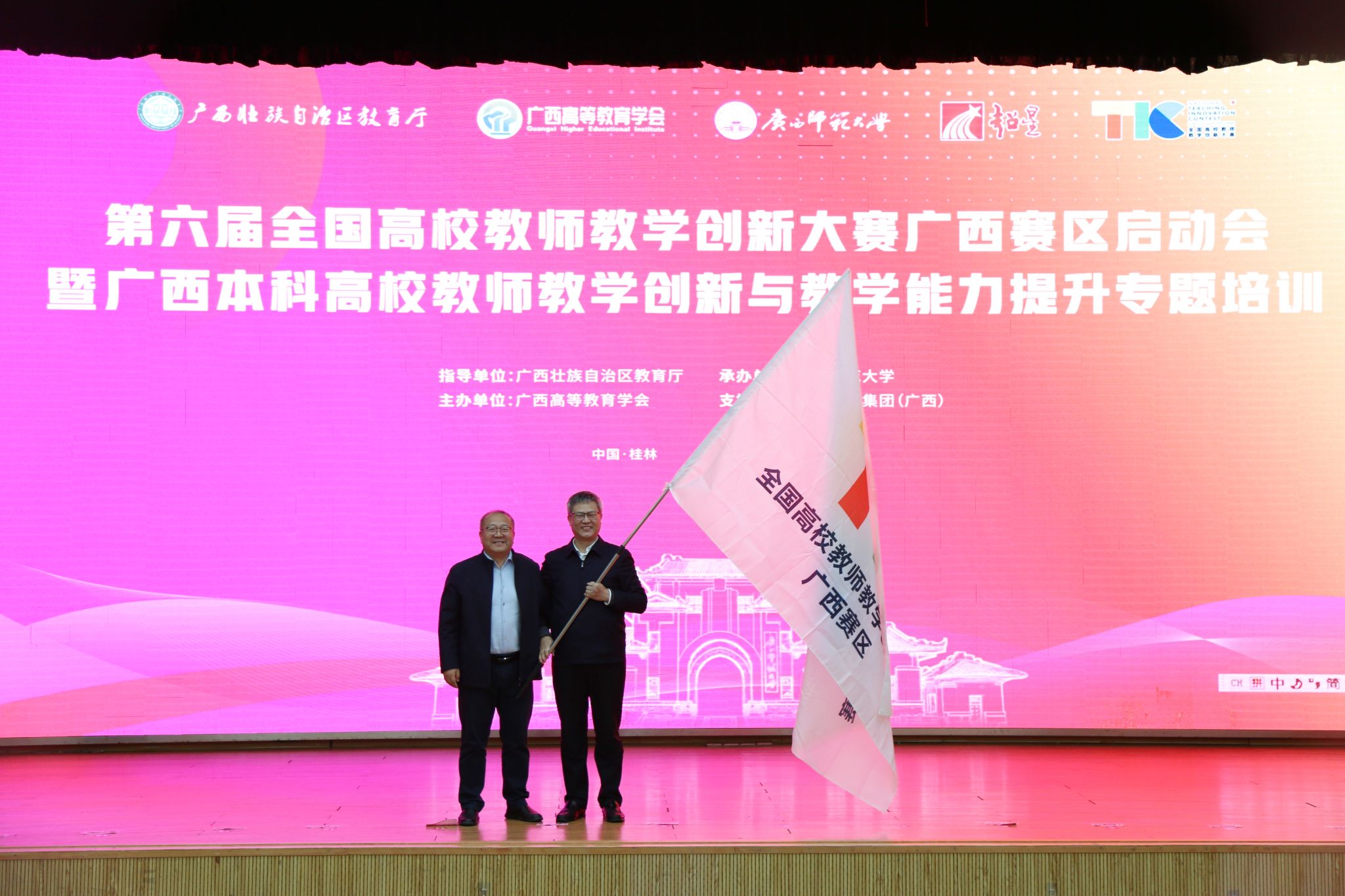 赛事会旗交接仪式上,姜明国作为第五届赛事承办方代表,将赛旗郑重移交给本届承办单位广西师范大学副校长宋树祥。