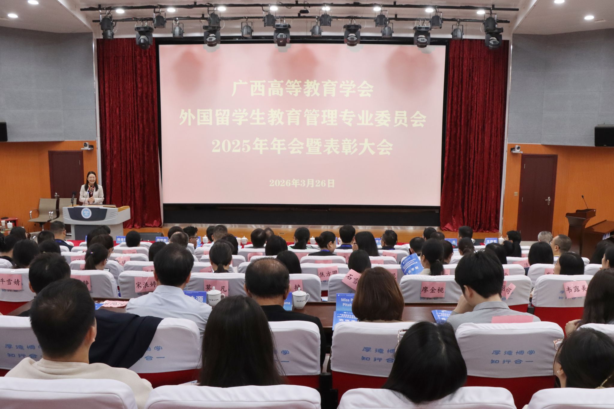 3月26日,广西高等教育学会外国留学生教育管理专业委员会2025年年会暨表彰大会在玉林师范学院召开。广西民族大学凭借扎实的来华留学教育管理工作、完善的留学生服务体系及优质的教育服务环境,荣获“2025年广西来华留学教育优秀单位”称号,学校法学院陈星,化学化工学院刘绍刚,国际教育学院梁冬梅、谢慧4位老师荣获“优秀个人”称号,国际教育学院陈玺伊、栾程程,文学院江雪3位老师荣获“优秀辅导员”称号。
