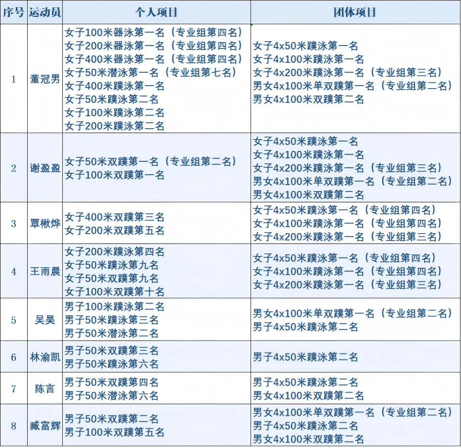 4月1日至6日,2026年全国蹼泳冠军赛暨世锦赛选拔赛、全国蹼泳青少年U系列赛(第一站)在广东举行。体育与健康科学学院斩获个人及团体项目11项冠军,2024级运动训练专业姚华莉包揽所参与项目的全部金牌。
