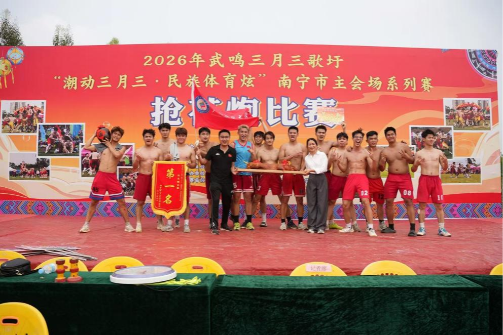 4月19日,2026年武鸣三月三歌圩暨“潮动三月三·民族体育炫”南宁市主会场系列赛抢花炮比赛在武鸣体育馆举行,广西民族大学花炮队以5:0的压倒性优势成功卫冕,实现三连冠。